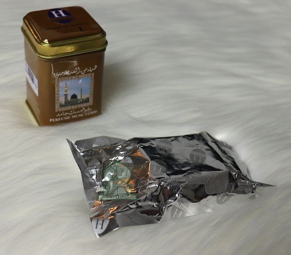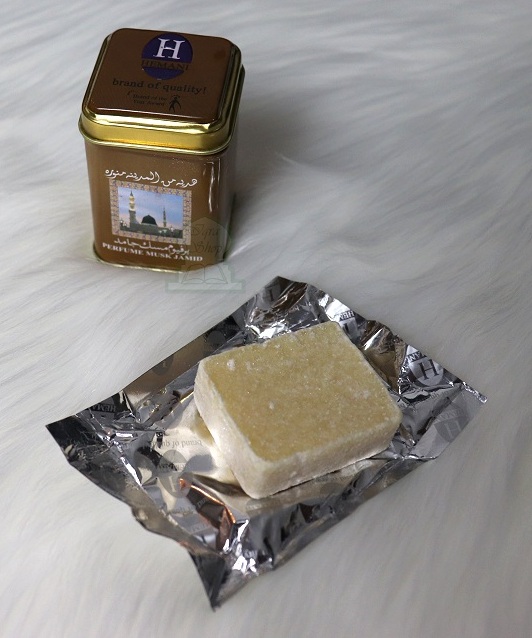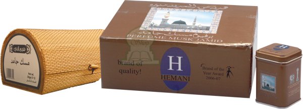 Hemani : Musc Jamid (solide) en morceaux (30 gr) dans une boite cadeau métallique qui permet de bien conserver le parfum. Permet de parfumer durablement vos pièces, peut être placé dans les armoire, ou frotté contres des objets, des vêtements, le corps, etc.