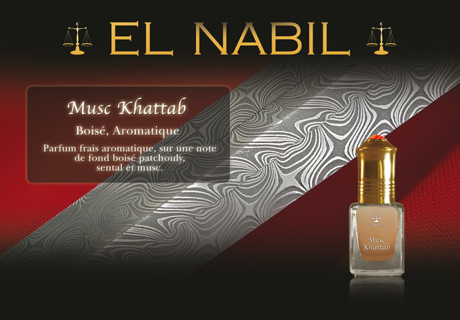 Parfum El Nabil "Musc Khattab" : Boisé, aromatique... Parfum frais aromatique, sur une note de fond boisé patchouli, santal et musc.