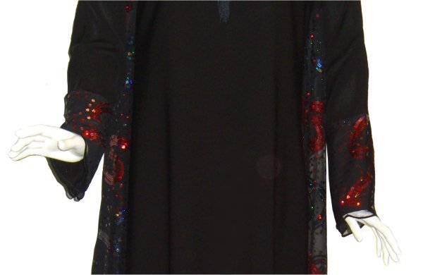 Robe de soirée Hanane noire et rouge avec un châle en dentelle coloré au niveau des manches...