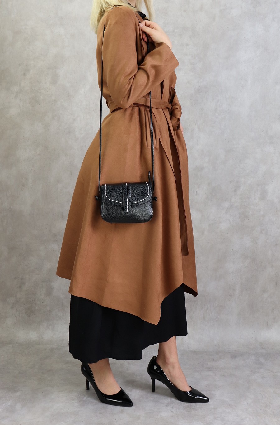 Veste trench mi long, fermeture croisée par une ceinture assortie à passants, 2 poches plaquées, effet nubuck, tissu légèrement épais.