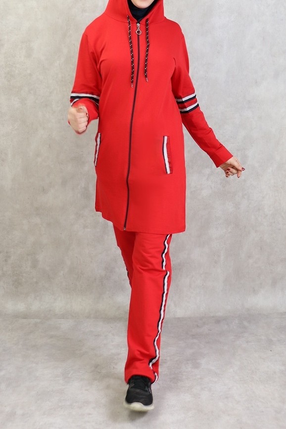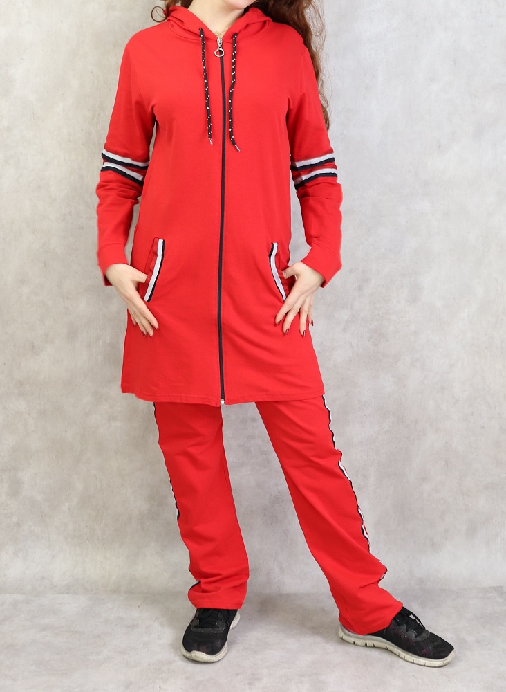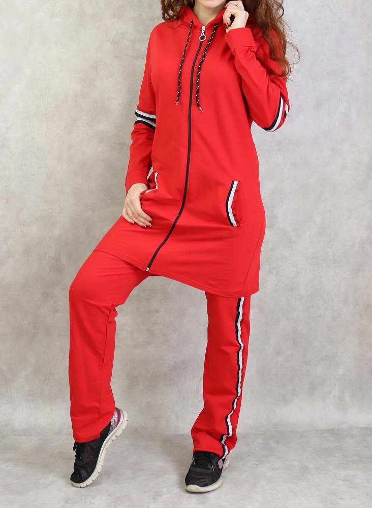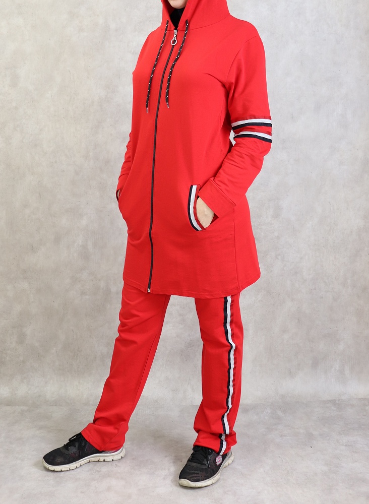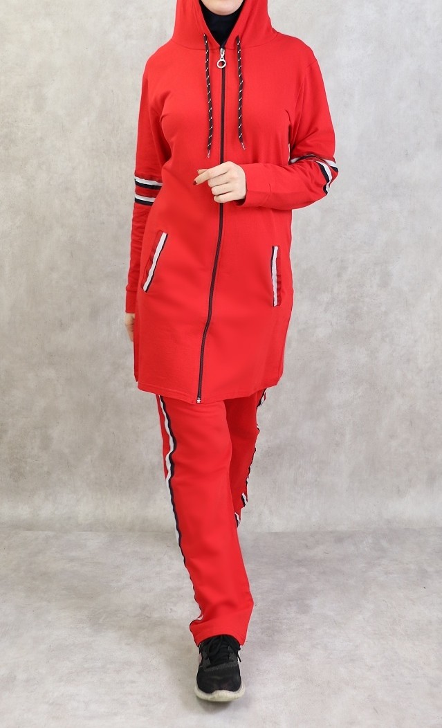 Survêtement 2 pièces. Veste : mi longue, capuche avec liens de serrage, fermeture zippée, 2 poches latérales, coupe droite, matière sweat. Pantalon : coupe droite, taille élastique.