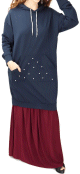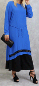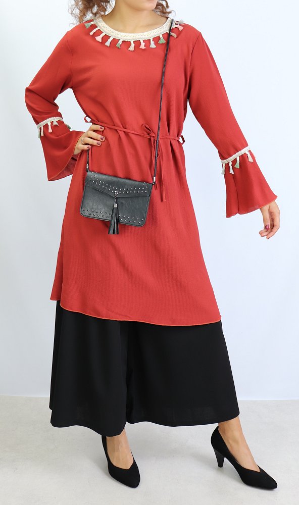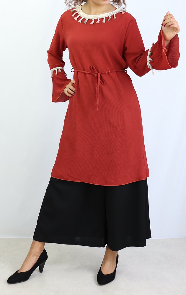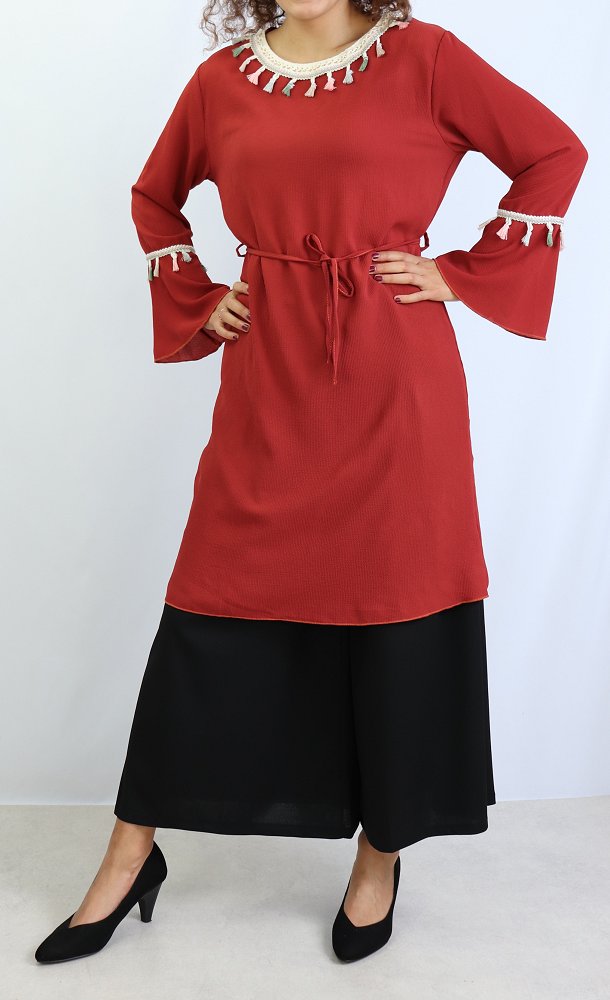 Tunique longue, tissu effet crêpe, avec des pompons colorés sur le col rond et au manches, Elle peut se porter décontractée ou un peu plus habillée avec sa ceinture assortie.